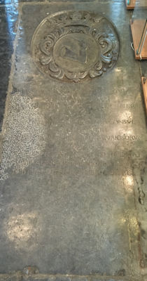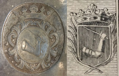 Op de grafsteen komen we wel interessante gegevens tegen. Zo zien we daar zijn wapenschild, een opgeheven arm met een degen. Hetzelfde wapen dat we ook zien op de prent die ik op de rommelmarkt kocht. Onder die prent staat de volgende tekst te lezen: