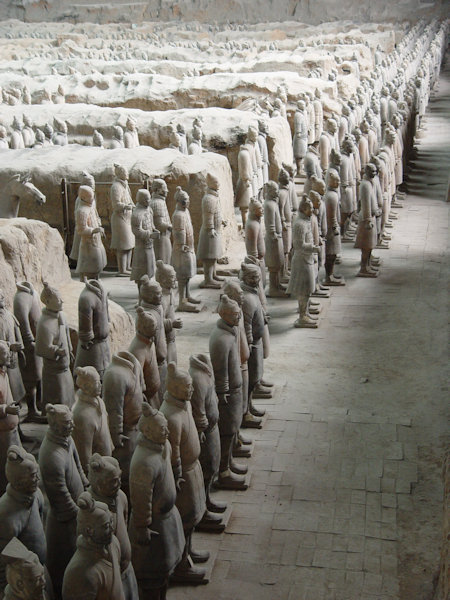 Op 29 maart 1974 deden Chinese boeren, die een put wilden graven, een ontdekking: een soldaat van terracotta. Het was het begin van de grootste archeologische opgraving ooit. Duizenden soldaten zijn sindsdien aan het licht gekomen. Het terracottaleger bestaat uit voetvolk, kruisboogschutters en ruiters met strijdwagens en paarden. Een deel van het leger is levensgroot en gepolychromeerd. Andere soldaten zijn tussen de 50 en 75 centimeter groot. Inmiddels zijn er 8000 terracottakrijgers opgegraven, maar het is niet uitgesloten dat er zich nog meer onder de grond bevinden. De enorme legermacht moet de keizer hebben bewaakt en mogelijk ook hebben begeleid in zijn postuum streven naar onsterfelijkheid. Ook al is hij daarin niet geslaagd, het laat wel zien hoe machtig en misschien ook wel krachtig de keizer bij leven al is geweest.